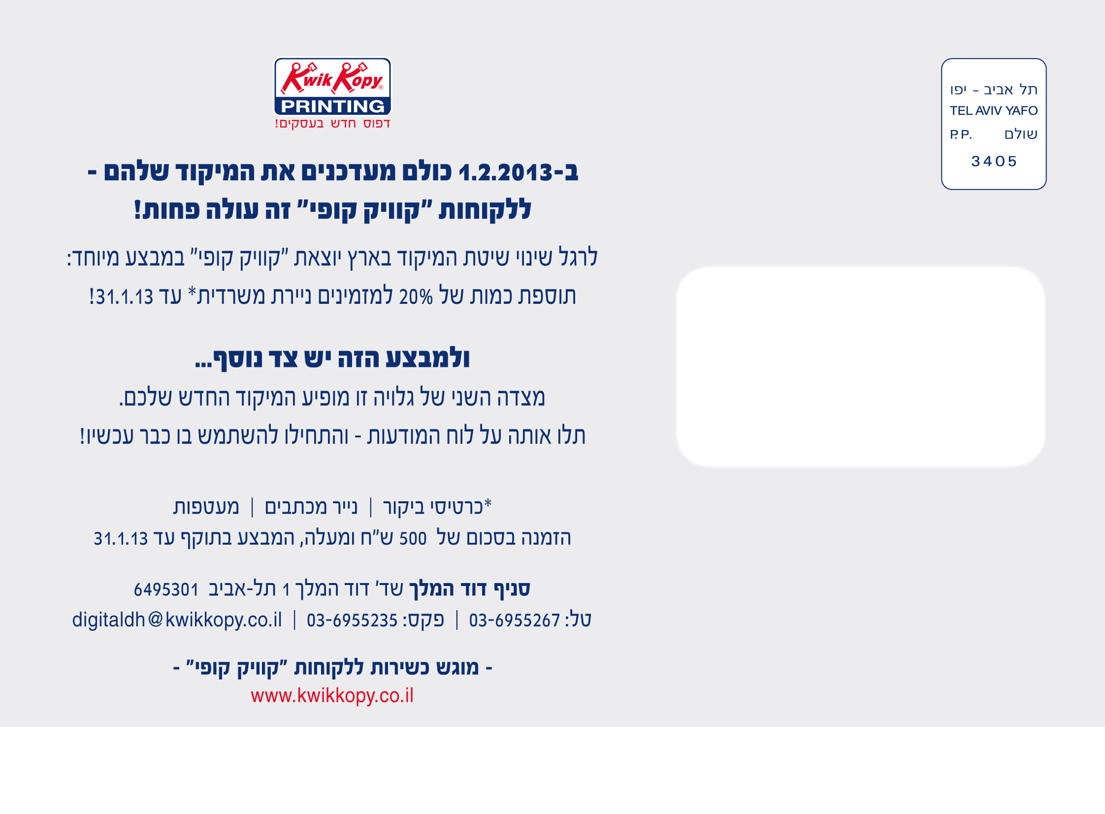 * שולחים גלויה עם קוד קופון לקבלת הנחה ברכישה באתר האינטרנט.